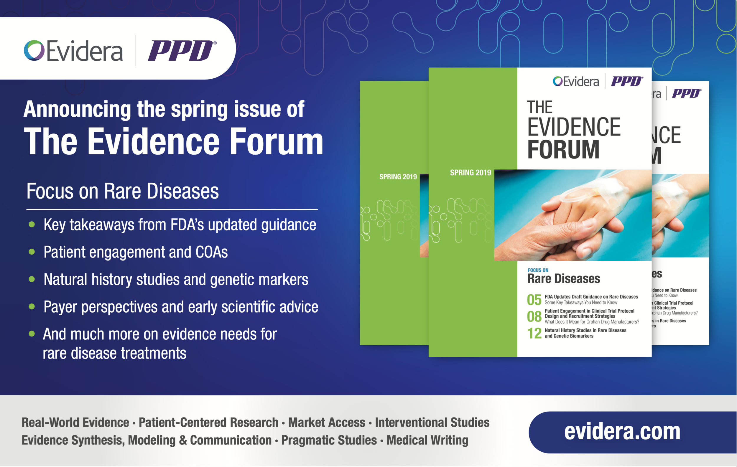 Branding and marketing communications developed for Evidera | PPD from 2017-2020. Conference exhibit, advertisements, and branded studies.